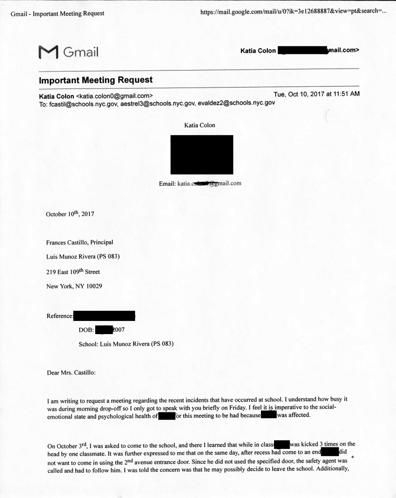 In June 2018, when I wrote a personal letter to superintendent Alexandra Estrella about how my minor child and I were harassed, discriminated and retaliated upon, she never responded to me. Even in June 2017, when I emailed superintendent Alexandra Estrella as my child experienced persistent bullying, she did not even reply to my email at all.