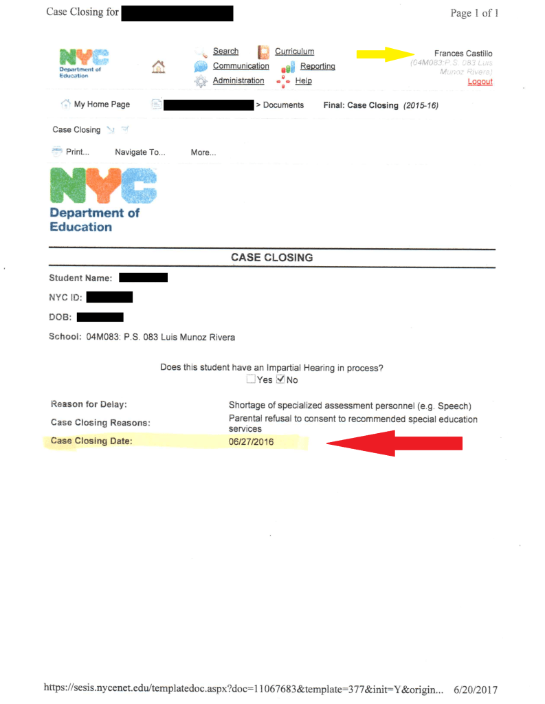 What I would hear from Principal Frances Castillo about my child led me to make a request for his special education records. On June 20, 2017, during a meeting at my request, I asked Principal Frances Castillo for my son’s academic records, and the only thing she gave me as she was logged into SESIS was the special education case closing letter below, which shows that my son’s special education case was closed on June 27, 2016. Since she was the PS 83 principal, I believed Principal Castillo when she told me the letter below was my child’s special education case closing letter.