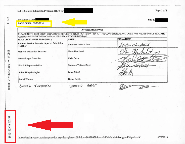 The initial eligibility meeting occurred on June 23, 2016, as shown by the yellow rectangle and arrow on the attendance page. However, you can also see that it was backdated to December 16, 2015, at 8:52PM, which can be seen by the red rectangle and arrow. By backdating the attendance page, the City Department of Education misrepresented information and made it appear as though I was not in attendance at the eligibility meeting, but you can clearly see my signature.