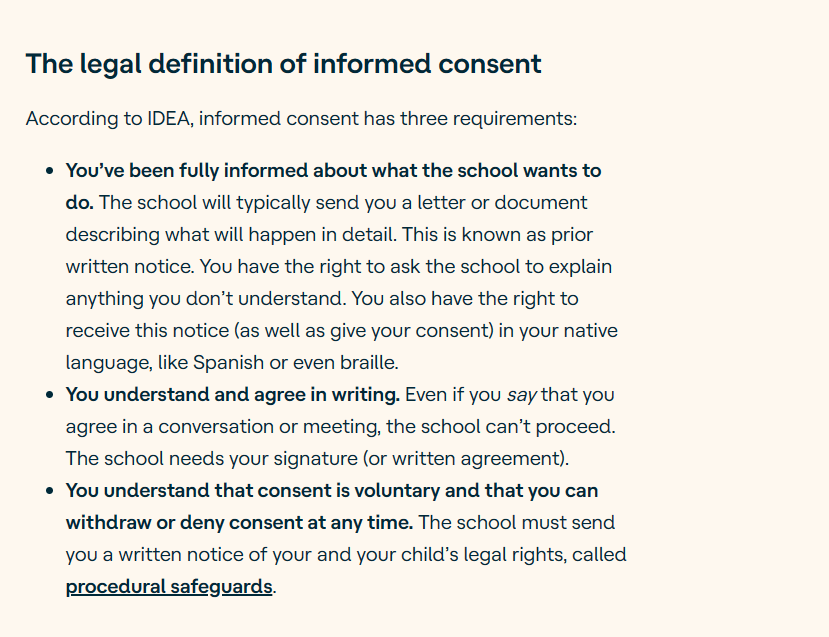 The procedural safeguard is heavy on parental consent, special education, and parental rights. I did not know that by providing my signature, I was unknowingly placing my son into special education. In other words, by signing your name in the attendance page’s signature line, you are unknowingly or knowingly, depending on your specific situation, placing your child in special education with or without your consent. BUT there are exceptions. Meaning, there are ways to sign the attendance page without compromising yourself, but that is for a later post.