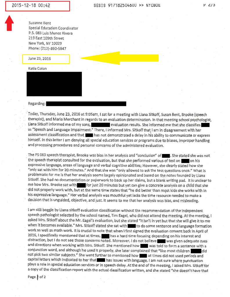 On June 24, 2016, the day after the initial eligibility meeting, I walked into the PS 83 psychologist’s office, provided the school psychologist with a two-page letter denying special education and services, and provided reasons in detail. What should have happened was for the City Department of Education staff to close my son’s special education case and remove him from special education, primarily since I never once gave them consent and had provided them with a parental refusal letter as shown below.